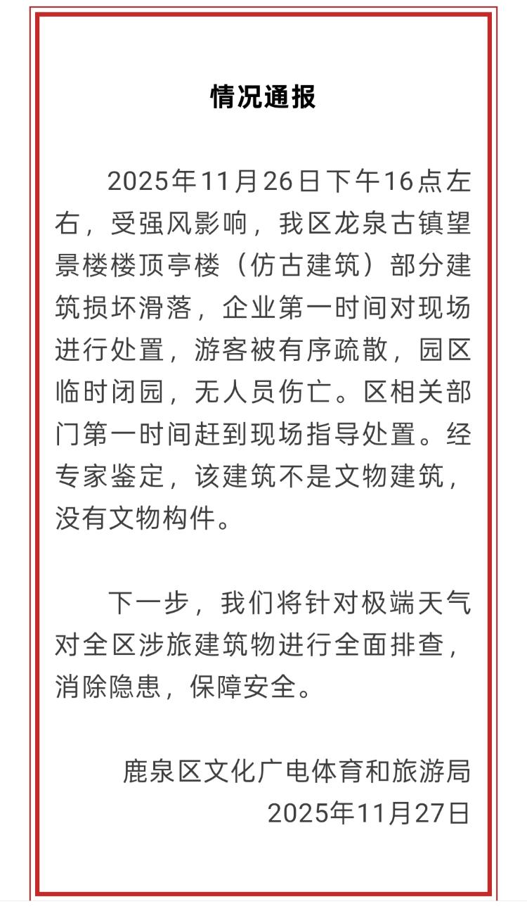 11月27日,海报新闻记者田柳称,河北省石家庄市鹿泉区文化广电体育和旅游局发布情况通报称:“11月26日16时00分左右,鹿泉区龙泉古镇望京塔(古建筑)屋顶亭(古建筑)部分因大风损坏、倒塌。”公司立即响应现场,有序疏散游客,园区暂时关闭。没有受害者。病区相关部门立即赶赴现场并指导处理。经专家鉴定,确定该建筑不属于文化遗产建筑,不含有任何文化遗产元素。下一步,鹿泉区将针对异常天气情况,对区内旅游相关建筑开展全面排查。消除隐患,确保安全。据海报新闻(记者微信公众号:HaibaoNewsSw)此前报道,一段“石家庄市龙泉古镇景区门口凉亭倒塌”的视频在网络上流传,引起广泛关注。景区一位工作人员告诉海报新闻记者,景区内部未受影响,27日暂时关闭进行维护。如果您能为我们提供进一步的建议,我们将不胜感激。一旦通过,我们将及时发布公告。海报新闻报道热线:010-64004224,微信报道:HaibaoNewsSw。