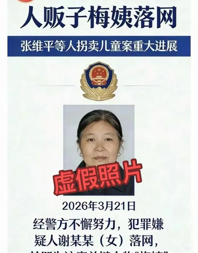 3月21日,经过警方的不懈努力,“张卫平拐卖儿童案”取得重大进展。被捕者正是罪魁祸首谢萌萌(女),人称“梅姨”,是该案的重要人物。据南方都市报报道,近日,网上流传一张所谓“梅姨”佩戴警徽被捕的照片。 3月22日,记者从相关部门获悉,网上发布的照片​​并非警方发布,照片中所谓“梅姨”的照片系伪造照片。这张照片不是警方发布的,是假的。此外,近期有社交平台账号发帖称,拐卖儿童案的核心人物“梅姨”在广州三元里被警方抓获。相关内容正在引起关注。记者22日在采访相关人士时发现,《邮报》内容系虚假信息。部门。无法再访问虚假帖子。律师:“梅姨很难抓”,可能是因为她太普通了。据央视报道,2005年1月,沉聪在广州增城租住的房子里被人贩子强行带走,并在广东省河源市紫金县被绑架。 2020年3月,她被救出。申空的父亲申军良说,当他第一次听说梅阿姨被捕的消息时,难掩兴奋之情。 “梅姨”为何失踪这么久?申军良的律师刘畅分析道:“并不是说她有特别强的反侦查能力,或者有什么特殊的手段,事实上,很可能是因为她太普通了,所以很难想象她是一个罪犯。从张卫平的解读来看,‘梅姨’可能不会认为自己在犯罪,甚至可能会认为自己在做一件好事,所以她才会是那样的人。”由于她的社会角色,没有人能找到她相对较长的时间。 (湖北日记)